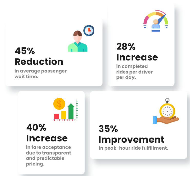 The platform delivered a 45% reduction in average passenger wait time, increased completed rides per driver by 28%, and achieved a 35% improvement in peak-hour ride fulfillment. Transparent and predictable pricing also led to a 40% increase in fare acceptance, strengthening overall user trust and engagement.